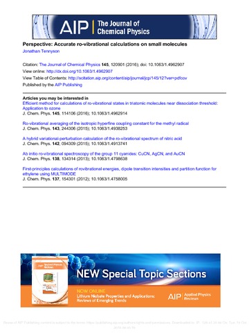 | Additional information: | The following article appeared in Journal of Chemical Physics [Tennyson, J; (2016) Perspective: Accurate ro-vibrational calculations on small molecules. Journal of Chemical Physics, 145 (12), Article 120901. 10.1063/1.4962907] and may be found at http://dx.doi.org/10.1063/1.4962907. This article may be downloaded for personal use only. Any other use requires prior permission of the author and AIP Publishing. |