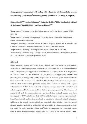 | Title: | Hydrogenase biomimetics with redox-active ligands: Electrocatalytic proton reduction by [Fe2(CO)4(κ2-diamine)(μ-edt)] (diamine = 2,2′-bipy, 1,10-phen) |