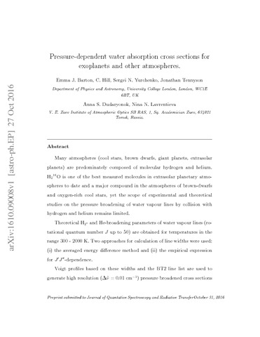 Many atmospheres (cool stars, brown dwarfs, giant planets, extrasolar planets) are predominately composed of molecular hydrogen and helium. H216O is one of the best measured molecules in extrasolar planetary atmospheres to date and a major compound in the atmospheres of brown-dwarfs and oxygen-rich cool stars, yet the scope of experimental and theoretical studies on the pressure broadening of water vapour lines by collision with hydrogen and helium remains limited. Theoretical H2- and He-broadening parameters of water vapour lines (rotational quantum number J up to 50) are obtained for temperatures in the range 300–2000 K. Two approaches for calculation of line widths were used: (i) the averaged energy difference method and (ii) the empirical expression for J′J″-dependence. Voigt profiles based on these widths and the BT2 line list are used to generate high resolution (View the MathML source) pressure broadened cross sections for a fixed range of temperatures and pressures between 300 and 2000 K and 0.001–10 bar. An interpolation procedure which can be used to determine cross sections at intermediate temperature and pressure is described. Pressure broadening parameters and cross sections are presented in new ExoMol format.