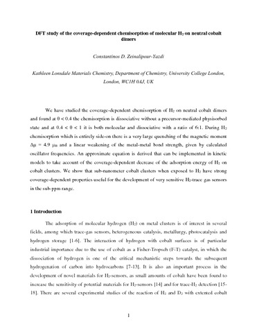 | Title: | DFT study of the coverage-dependent chemisorption of molecular H2 on neutral cobalt dimers |