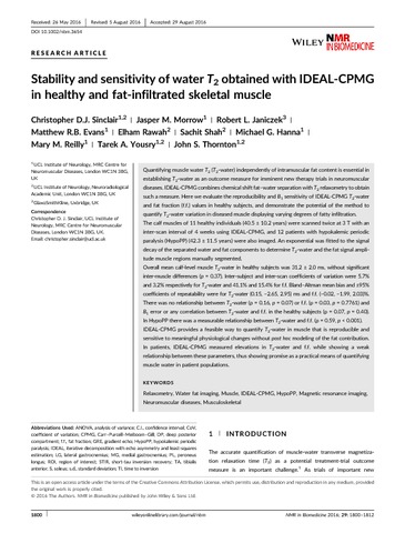 Title: | Stability and sensitivity of water T2 obtained with IDEAL-CPMG in healthy and fat-infiltrated skeletal muscle |