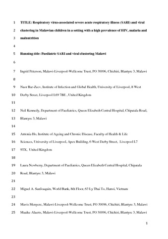 Additional information: | This is a pre-copyedited, author-produced PDF of an article accepted for publication in Journal of Infectious Diseases following peer review. The version of record Ingrid Peterson, Naor Bar-Zeev, Neil Kennedy, Antonia Ho, Laura Newberry, Miguel A. SanJoaquin, Mavis Menyere, Maaike Alaerts, Gugulethu Mapurisa, Moses Chilombe, Ivan Mambule, David G. Lalloo, Suzanne T. Anderson, Thembi Katangwe, Nigel Cunliffe, Nico Nagelkerke, Meredith McMorrow, Marc-Allain Widdowson, Neil French, Dean Everett, and Robert S. Heyderman: Respiratory Virus–Associated Severe Acute Respiratory Illness and Viral Clustering in Malawian Children in a Setting With a High Prevalence of HIV Infection, Malaria, and Malnutrition J Infect Dis. (2016) 214 (11): 1700-1711. is available online at: http://dx.doi.org/10.1093/infdis/jiw426. |