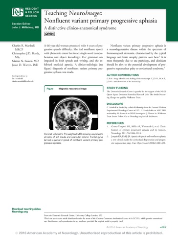 | Title: | Teaching NeuroImages: Nonfluent variant primary progressive aphasia: A distinctive clinico-anatomical syndrome |