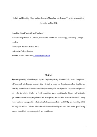 Title: | Hubris and Humility Effect and the Domain-Masculine Intelligence Type in Two Countries: Colombia and the UK |
