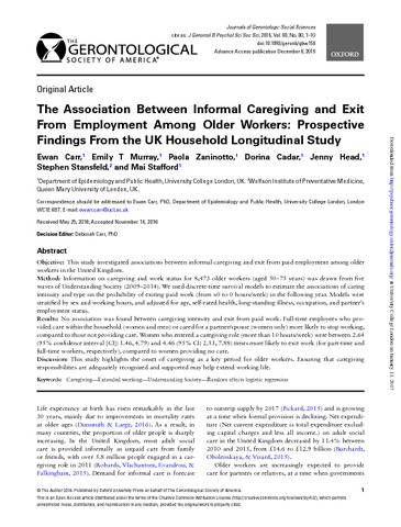 | Title: | The Association Between Informal Caregiving and Exit From Employment Among Older Workers: Prospective Findings From the UK Household Longitudinal Study |
