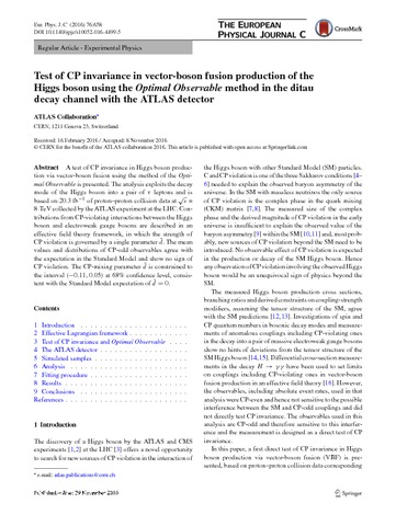 | Title: | Test of CP invariance in vector-boson fusion production of the Higgs boson using the Optimal Observable method in the ditau decay channel with the ATLAS detector |
