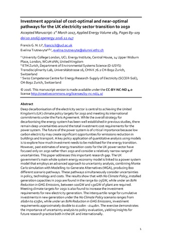 | Title: | Investment appraisal of cost-optimal and near-optimal pathways for the UK electricity sector transition to 2050 |