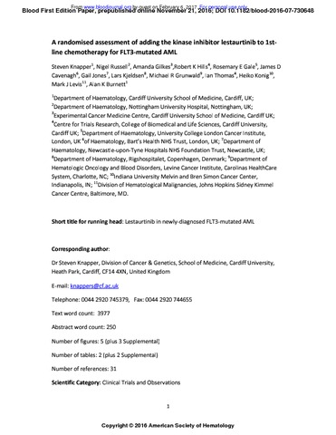 Additional information: | This research was originally published in Blood Online. Steven Knapper, Nigel Russell, Amanda Gilkes, Robert K. Hills, Rosemary E. Gale, James D. Cavenagh, Gail Jones, Lars Kjeldsen, Michael R. Grunwald, Ian Thomas, Heiko Konig, Mark J. Levis, Alan K. Burnett, A randomised assessment of adding the kinase inhibitor lestaurtinib to 1st-line chemotherapy for FLT3-mutated AML, in: Blood Jan 2016, blood-2016-07-730648; DOI: 10.1182/blood-2016-07-730648 |