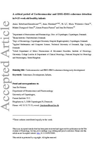 Additional information: | This is the peer reviewed version of the following article: Ritterband-Rosenbaum, A; Herskind, A; Li, X; Willerslev-Olsen, M; Olsen, MD; Farmer, SF; Nielsen, JB; (2016) A critical period of Corticomuscular and EMG-EMG coherence detection in 9-25 week old healthy infants, The Journal of Physiology, which has been published in final form at: http://dx.doi.org/10.1113/JP273090. This article may be used for non-commercial purposes in accordance with Wiley Terms and Conditions for Self-Archiving. |