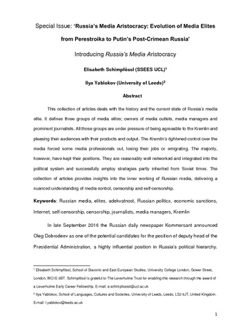 This collection of articles deals with the history and the current state of Russia’s media elite. It defines three groups of media elites; owners of media outlets, media managers and prominent journalists. All those groups are under pressure of being agreeable to the Kremlin and pleasing their audiences with their products and output. The Kremlin’s tightened control over the media forced some media professionals out, losing their jobs or emigrating. The majority, however, have kept their positions. They are reasonably well networked and integrated into the political system and successfully employ strategies partly inherited from Soviet times. The collection of articles provides insights into the inner working of Russian media, delivering a nuanced understanding of media control, censorship and self-censorship.