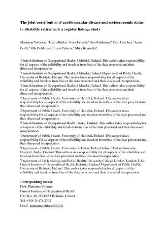 | Title: | The joint contribution of cardiovascular disease and socioeconomic status to disability retirement: A register linkage study |