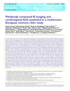 | Title: | Pittsburgh compound B imaging and cerebrospinal fluid amyloid-β in a multicentre European memory clinic study |