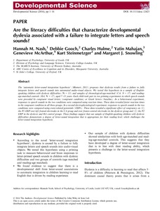 Title: | Are the literacy difficulties that characterize developmental dyslexia associated with a failure to integrate letters and speech sounds? |