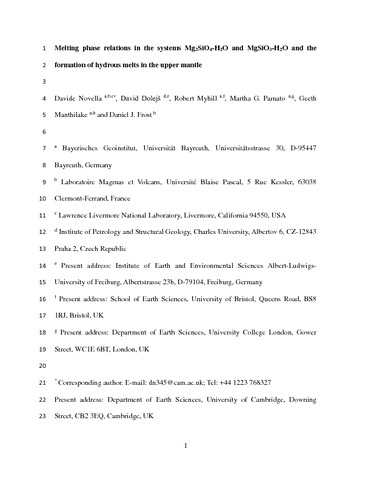 Title: | Melting phase relations in the systems Mg2SiO4-H2O and MgSiO3-H2O and the formation of hydrous melts in the upper mantle |