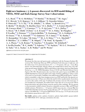 | Title: | Eight new luminous z >= 6 quasars discovered via SED model fitting of VISTA, WISE and Dark Energy Survey Year 1 observations |