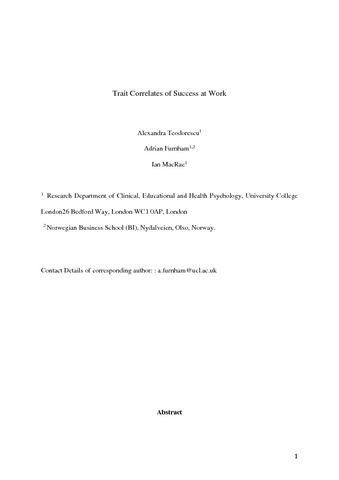 Additional information: | Copyright © 2017 John Wiley & Sons Ltd. This is the peer reviewed version of the following article: [Teodorescu A, Furnham A, MacRae I. Trait correlates of success at work. Int J Select Assess. 2017;25:36–42. https://doi.org/10.1111/ijsa.12158], which has been published in final form at http://dx.doi.org/10.1111/ijsa.12158. This article may be used for non-commercial purposes in accordance with Wiley Terms and Conditions for Self-Archiving. |