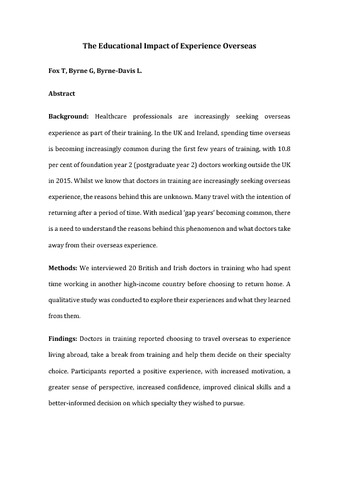 Background: Healthcare professionals are increasingly seeking overseas experience as part of their training. In the UK and Ireland, spending time overseas is becoming increasingly common during the first few years of training, with 10.8 per cent of foundation year 2 (postgraduate year 2) doctors working outside the UK in 2015. Whilst we know that doctors in training are increasingly seeking overseas experience, the reasons behind this are unknown. Many travel with the intention of returning after a period of time. With medical ‘gap years’ becoming common, there is a need to understand the reasons behind this phenomenon and what doctors take away from their overseas experience. Methods: We interviewed 20 British and Irish doctors in training who had spent time working in another high-income country before choosing to return home. A qualitative study was conducted to explore their experiences and what they learned from them. Findings: Doctors in training reported choosing to travel overseas to experience living abroad, take a break from training and help them decide on their specialty choice. Participants reported a positive experience, with increased motivation, a greater sense of perspective, increased confidence, improved clinical skills and a better-informed decision on which specialty they wished to pursue. Discussion: Working overseas can be a positive educational experience for doctors in training. Although increasing numbers of doctors are choosing to work abroad, many wish to return to their countries of origin to complete training, and doctors should not be discouraged from undertaking additional experience overseas.