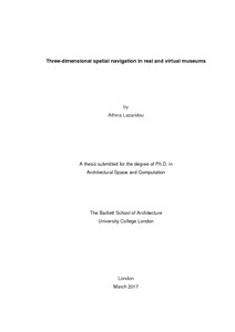 A key issue in the architectural design of atria museums is the variety of ways users can interact with the three-dimensional layout of space to create emergent patterns of spatial navigation. This issue is addressed in the context of a coherent body of literature which, together with space syntax theory and method, real time observations, agent-based models and virtual reality environments provides a specific rigour in the spatial analysis of the layouts and exploration patterns. The intention is to evolve an overview of these three-dimensional spatial and navigational aspects; thus enriching the development of the two-dimensional space syntax approach and contributing to a better understanding of the architectural design of museums. Most space syntax studies on human navigation focus on spatial characteristics and route choices in two dimensions and have not yet properly addressed the effect of the third dimension on exploration. This thesis studies three European atria museums: the Ashmolean Museum in Oxford, the Museum of Scotland in Edinburgh and the Acropolis Museum in Athens, which, taken together, provide a basis for investigating the theoretical and methodological questions of this thesis. The analysis begins from the apparent similarities among the museums, creating a suitable background for exploring critical differences with regards to their spatial layout and visiting patterns. The results deriving from this analysis are then used to create systematic variations in the virtual reality (VR) experiment being conducted at the Ashmolean Museum, examining correspondences between users’ experiences in the real and in virtual environments. Significant analogies are demonstrated between real and virtual behaviour with the findings showing how the museums’ three‐dimensional architectural design impacts significantly on the navigational processes of visitors. Although the atria in all three buildings are used as compositional devices structuring relationships between exhibition spaces and the three dimensional organisation of buildings, there are significant differences in terms of how this relationship is structured and the differing impacts produced on navigation patterns and gaze directions. The present study ultimately leads to a deeper understanding of architectural design regarding three-dimensional museum environments, and its implications for users’ social and cognitive processes.