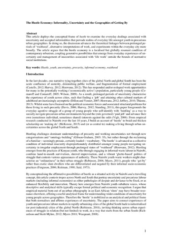 This article deploys the conceptual frame of hustle to examine the everyday dealings associated with uncertainty and accepted informalities that pervade realms of everyday life amongst youth in precarious urban geographies. In doing so, the discussion advances the theoretical linkages between prolonged pe- riods of ‘waithood’, alternative interpretations of work, and experiments within the everyday city more broadly. The article argues that the hustle economy is a localised but globally resonant condition of contemporary urbanism, coupling generative possibilities that emerge from everyday experiences of un- certainty and management of insecurities associated with ‘life work’ outside the bounds of normative social institutions.