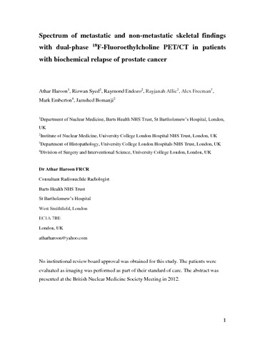 | Title: | Spectrum of metastatic and nonmetastatic skeletal findings with dual-phase 18F-FECH PET/CT in patients with biochemical relapse of prostate cancer |