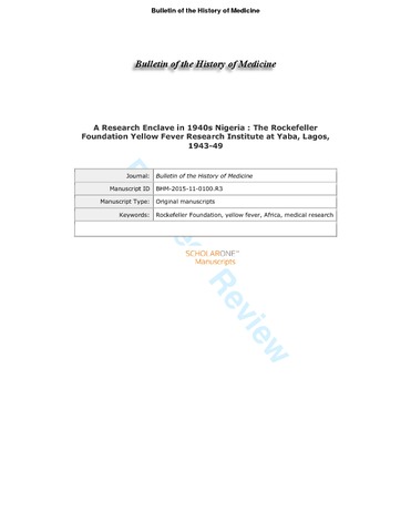 A Research Enclave in 1940s Nigeria: The Rockefeller Foundation Yellow Fever Research Institute at Yaba, Lagos, 1943–49.