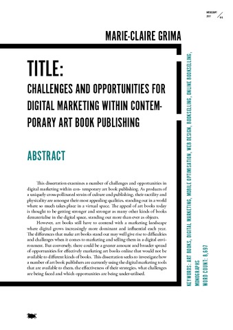 This dissertation examines a number of challenges and opportunities in digital marketing within contemporary art book publishing. As products of a uniquely cross-pollinated strain of culture and publishing, their tactility and physicality are amongst their most appealing qualities, standing out in a world where so much takes place in a virtual space. The appeal of art books today is thought to be getting stronger and stronger as many other kinds of books dematerialise in the digital space, standing out more than ever as objects. However, art books still have to contend with a marketing landscape where digital grows increasingly more dominant and influential each year. The differences that make art books stand out may well give rise to difficulties and challenges when it comes to marketing and selling them in a digital environment. But conversely, there could be a greater amount and broader spread of opportunities for effectively marketing art books online that would not be available to different kinds of books. This dissertation seeks to investigate how a number of art book publishers are currently using the digital marketing tools that are available to them, the effectiveness of their strategies, what challenges are being faced and which opportunities are being under-utilised.
