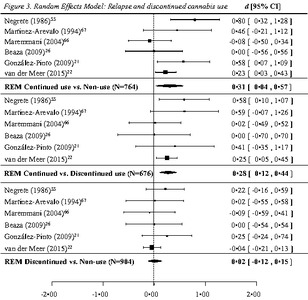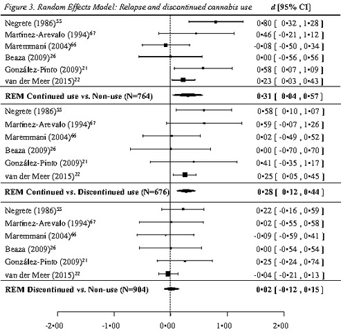 BACKGROUND: Although the link between cannabis use and development of psychosis is well established, less is known about the effect of continued versus discontinued cannabis use after the onset of psychosis. We aimed to summarise available evidence focusing on the relationship between continued and discontinued cannabis use after onset of psychosis and its relapse. METHODS: In this systematic review and meta-analysis, we searched MEDLINE for articles published in any language from the database inception date up until April 21, 2015 that included a sample of patients with a pre-existing psychotic disorder with a follow-up duration of at least 6 months. We used a combination of search terms for describing cannabis, the outcome of interest (relapse of psychosis), and the study population. We excluded studies if continued cannabis use or discontinued cannabis use could not be established. We compared relapse outcomes between those who continued (CC) or discontinued (DC) cannabis use or were non-users (NC). We used summary data (individual patient data were not sought out) to estimate Cohen's d, which was entered into random effects models (REM) to compare CC with NC, CC with DC, and DC with NC. Meta-regression and sensitivity analyses were used to address the issue of heterogeneity. FINDINGS: Of 1903 citations identified, 24 studies (16 565 participants) met the inclusion criteria. Independent of the stage of illness, continued cannabis users had a greater increase in relapse of psychosis than did both non-users (dCC–NC=0·36, 95% CI 0·22–0·50, p<0·0001) and discontinued users (dCC–DC=0·28, 0·12–0·44, p=0·0005), as well as longer hospital admissions than non-users (dCC–NC=0·36, 0·13 to 0·58, p=0·02). By contrast, cannabis discontinuation was not associated with relapse (dDC–NC=0·02, −0·12 to 0·15; p=0·82). Meta-regression suggested greater effects of continued cannabis use than discontinued use on relapse (dCC–NC=0·36 vs dDC–NC=0·02, p=0·04), positive symptoms (dCC–NC=0·15 vs dDC–NC=–0·30, p=0·05) and level of functioning (dCC–NC=0·04 vs dDC–NC=–0·49, p=0·008) but not on negative symptoms (dCC–NC=-0·09 vs dDC–NC=–0·31, p=0·41). INTERPRETATION: Continued cannabis use after onset of psychosis predicts adverse outcome, including higher relapse rates, longer hospital admissions, and more severe positive symptoms than for individuals who discontinue cannabis use and those who are non-users. These findings point to reductions in cannabis use as a crucial interventional target to improve outcome in patients with psychosis.