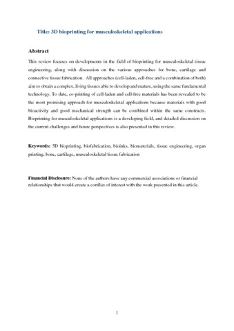 This review focuses on developments in the field of bioprinting for musculoskeletal tissue engineering, along with discussion on the various approaches for bone, cartilage and connective tissue fabrication. All approaches (cell-laden, cell-free and a combination of both) aim to obtain a complex, living tissues able to develop and mature, using the same fundamental technology. To date, co-printing of cell-laden and cell-free materials has been revealed to be the most promising approach for musculoskeletal applications because materials with good bioactivity and good mechanical strength can be combined within the same constructs. Bioprinting for musculoskeletal applications is a developing field, and detailed discussion on the current challenges and future perspectives is also presented in this review.