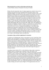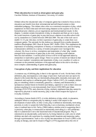Debates about the educational value of computer games have tended to focus on how education can benefit from their informational and skill-based content or their embedded pedagogy. This debate often relies on a restricted conception of play, which emphasises its benevolent and self-motivating character at the expense of its role in hierarchical peer relations, power negotiations and institutionalised rituals. In this chapter, I examine certain conceptions of play in education and then go on to study the social functions of game play in peer and power relations in an after-school club run by researchers in London between 2004 and 2006. The aim of the club was to enable 12-14 year olds draw on their experience of game play to create their own computer games. The rationale for this endeavour emerged from a media education tradition (Buckingham 2003, Burn & Durran 2007, Hobbs 1998). This emphasises the importance of extending conceptions of literacy to multimedia texts, and developing communicative abilities in a variety of modes and genres (see Carrington this volume). My focus is on how conceptions and enactments of what ‘play’ entails emerged from experiences of game play in the club, including social relations between club members. A second point of focus will be on the approach taken by researchers to teach about game design. These two points of interest are linked in that I will trace students’ conceptions and enactments of play over a number of weeks to comment on the potential usefulness of the approach taken in the club to develop a more complex understanding of games and game play.