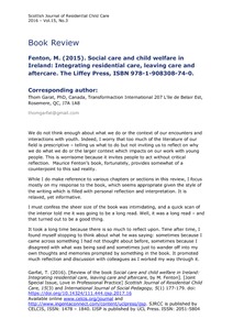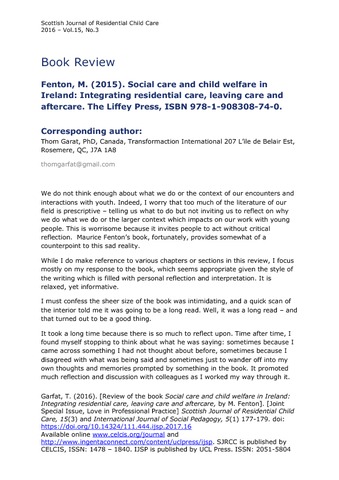 Fenton, M. (2015). Social care and child welfare in Ireland: Integrating residential care, leaving care and aftercare. The Liffey Press, ISBN 978-1-908308-74-0.
