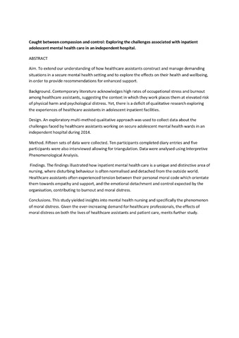 Aim. To extend our understanding of how healthcare assistants construct and managedemanding situations in a secure mental health setting and to explore the effects ontheir health and well-being, to provide recommendations for enhanced support.Background. Contemporary literature acknowledges high rates of occupationalstress and burnout among healthcare assistants, suggesting the context in whichthey work places them at elevated risk of physical harm and psychologicaldistress. Yet, there is a deficit of qualitative research exploring the experiences ofhealthcare assistants in adolescent inpatient facilities.Design. An exploratory multi-method qualitative approach was used to collectdata about the challenges faced by healthcare assistants working on secureadolescent mental health wards in an independent hospital during 2014.Method. Fifteen sets of data were collected. Ten participants completed diaryentries and five participants were also interviewed allowing for triangulation.Data were analysed using Interpretive Phenomenological Analysis.Findings. The findings illustrated how inpatient mental healthcare is a unique anddistinctive area of nursing, where disturbing behaviour is often normalized anddetached from the outside world. Healthcare assistants often experienced tensionbetween their personal moral code which orientate them towards empathy andsupport and the emotional detachment and control expected by the organization,contributing to burnout and moral distress.Conclusions. This study yielded insights into mental health nursing andspecifically the phenomenon of moral distress. Given the ever-increasing demandfor healthcare professionals, the effects of moral distress on both the lives ofhealthcare assistants and patient care, merits further study.