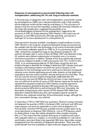 | Title: | Diagnosis of Cytomegalovirus Pneumonitis Following Stem Cell Transplantation: Addressing the Yin and Yang of Molecular Methods |