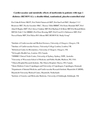 | Title: | Cardiovascular and metabolic effects of metformin in patients with type 1 diabetes (REMOVAL): a double-blind, randomised, placebo-controlled trial |