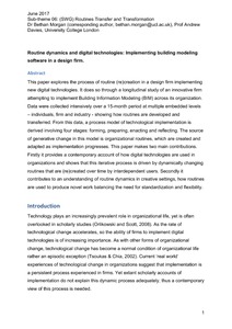 This paper explores the process of routine (re)creation in a design firm implementing new digital technologies. It does so through a longitudinal study of an innovative firm attempting to implement Building Information Modeling (BIM) across its organization. Data were collected intensively over a 15-month period at multiple embedded levels – individuals, firm and industry - showing how routines are developed and transferred. From this data, a process model of technological implementation is derived involving four stages: forming, preparing, enacting and reflecting. The source of generative change in this model is organizational routines, which are created and adapted as implementation progresses. This paper makes two main contributions. Firstly it provides a contemporary account of how digital technologies are used in organizations and shows that this iterative process is driven by dynamically changing routines that are (re)created over time by interdependent users. Secondly it contributes to an understanding of routine dynamics in creative settings, how routines are used to produce novel work balancing the need for standardization and flexibility.
