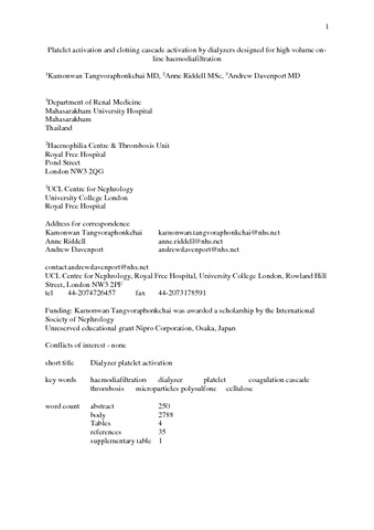| Title: | Platelet activation and clotting cascade 3 activation by dialyzers designed for high AQ1 4 volume online hemodiafiltration |
