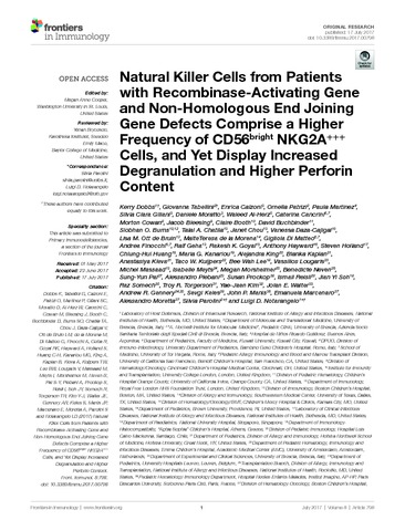 Title: | Natural Killer Cells from Patients with Recombinase-Activating Gene and Non-Homologous End Joining Gene Defects Comprise a Higher Frequency of CD56(bright) NKG2A+++ Cells, and Yet Display Increased Degranulation and Higher Perforin Content |