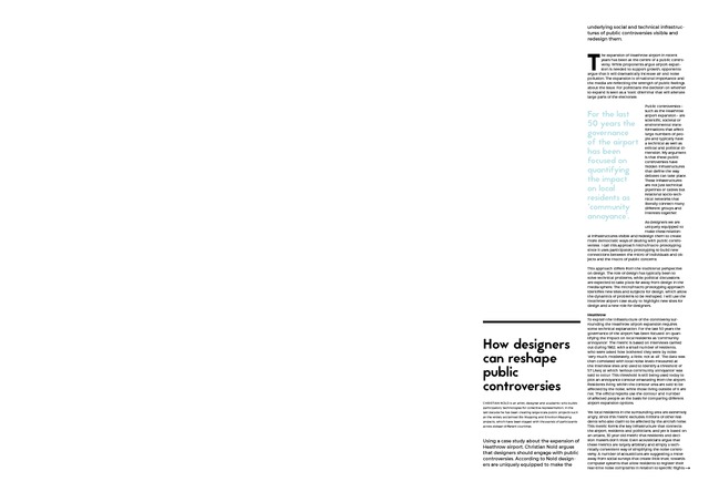 Using a case study about the expansion of Heathrow airport, Christian Nold argues that designers should engage with public controversies. According to Nold designers are uniquely equipped to make the underlying social and technical infrastructures of public controversies visible and redesign them.