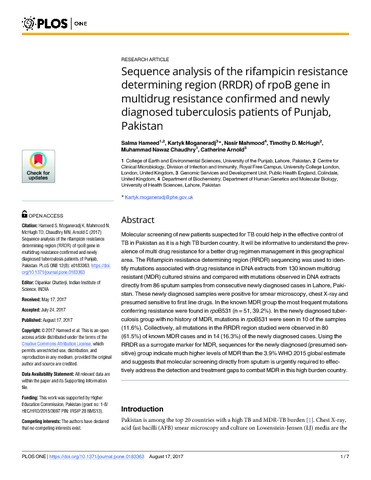 | Title: | Sequence analysis of the rifampicin resistance determining region (RRDR) of rpoB gene in multidrug resistance confirmed and newly diagnosed tuberculosis patients of Punjab, Pakistan |
