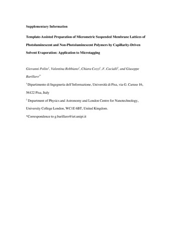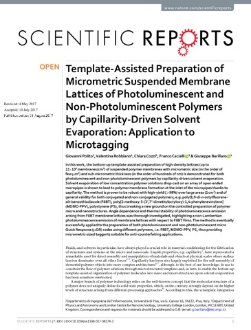 Title: | Template-Assisted Preparation of Micrometric Suspended Membrane Lattices of Photoluminescent and Non-Photoluminescent Polymers by Capillarity-Driven Solvent Evaporation: Application to Microtagging |