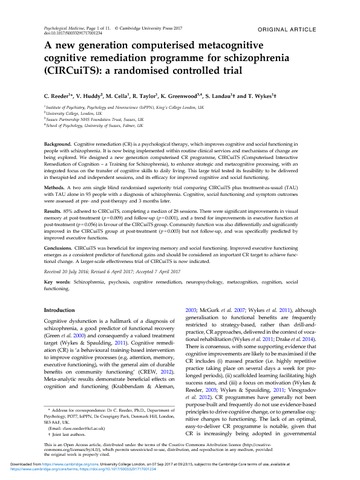 Title: | A new generation computerised metacognitive cognitive remediation programme for schizophrenia (CIRCuiTS): a randomised controlled trial |