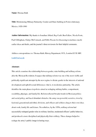 This article examines the relationship between gender, state-building, and military reform after the Mexican Revolution. It argues that military reform was one of the most visible and politically significant attempts by the new regime to dictate gender in the interests of national development and uphold sexual differences—that is, to modernize patriarchy. The article identifies the main phases in policies aimed at reshaping military habits, comportment, sociability, physique, and family life. Reform reflected broader trends in Mexican politics and social policy and faced abundant obstacles: the army was powerful, secretive, and riven by factional, generational, and ethnic divisions; officers and soldiers clung to their own ideas about work, family life, and leisure. Nevertheless, by the 1950s, military reform had successfully reshaped gender roles in military families, moderated officers’ public behavior, and produced a more disciplined and physically fitter soldiery. These changes helped to reshape the army’s public image in lasting ways.