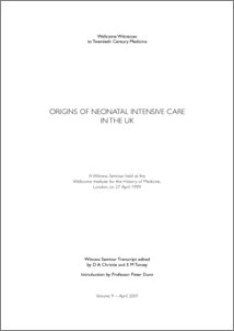 Chaired by Professor Robert Boyd, this seminar reviewed the development and changes in care of the newborn in the UK over the past 50 years. Advances in techniques were described, such as mechanical ventilation, total parenteral nutrition and continuous monitoring of vital signs, to care for ill or vulnerable newborn infants. Diagnostic techniques that were developed and introduced in the 1970s and early 1980s were discussed, such as ultrasound imaging, magnetic resonance spectroscopy and imaging and near infrared spectroscopy, for the non-invasive investigation of the brain, as well as the setting up of neonatal intensive care units. Witnesses include: Professor Eva Alberman, Dr Herbert Barrie, Professor Richard Cooke, Dr Beryl Corner, Dr Pamela Davies, Professor John Davis, Professor David Delpy, Professor Victor and Dr Lilly Dubowitz, the late Professor Harold Gamsu, Professor David Harvey, Professor Colin Normand, Professor Tom Oppé, Professor Osmund Reynolds, Dr Jean Smellie, Professor Maureen Young and nurses, including Miss Anthea Blake, Miss Caroline Dux and Miss Mae Nugent. Introduction by Professor Peter Dunn, viii, 84pp, 1 chart, glossary, subject and name index.